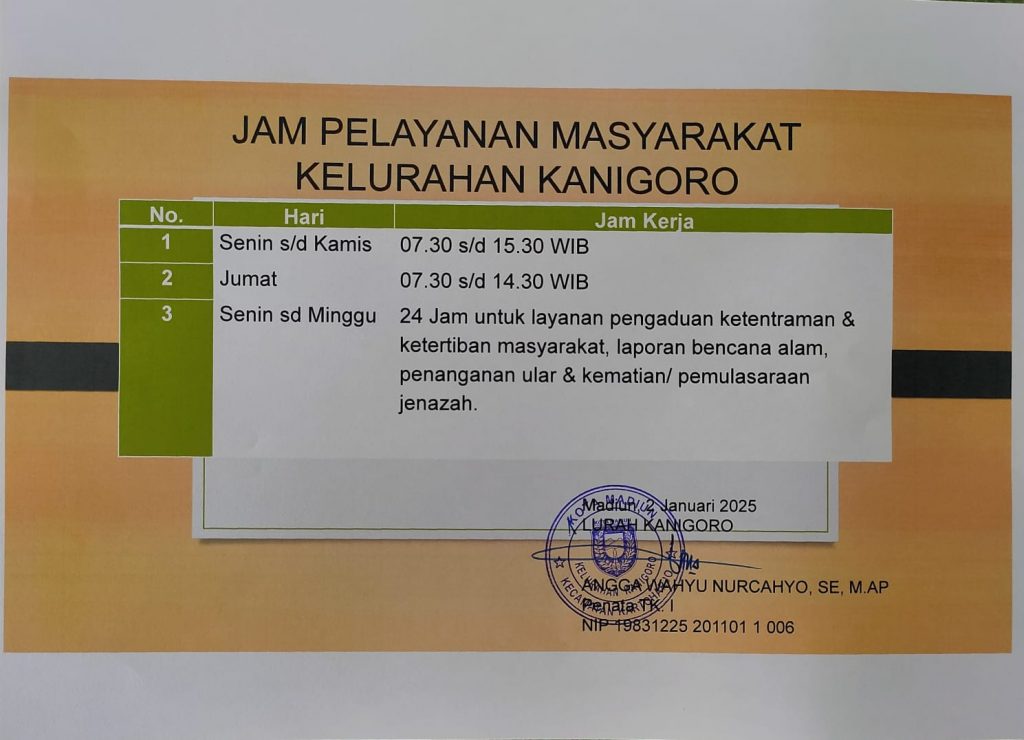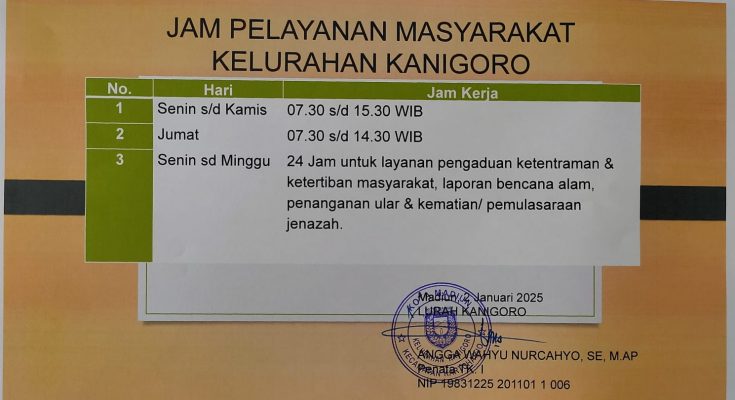 Berita / Informasi Setiap Saat / PPIDJAM PELAYANAN KELURAHAN KANIGORO 7 January 202531 July 2025 - by Ester Krist Ini adalah jam pelayanan Kelurahan Kanigoro